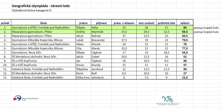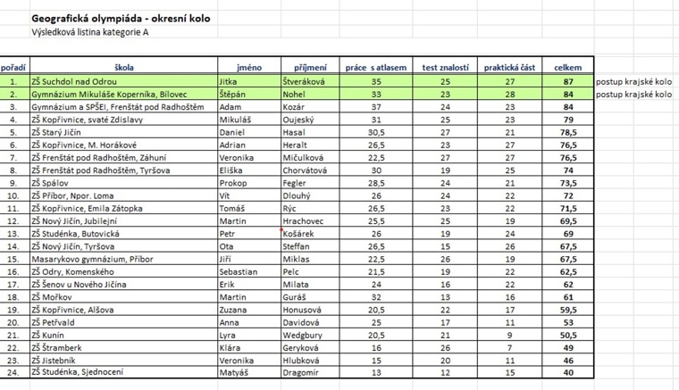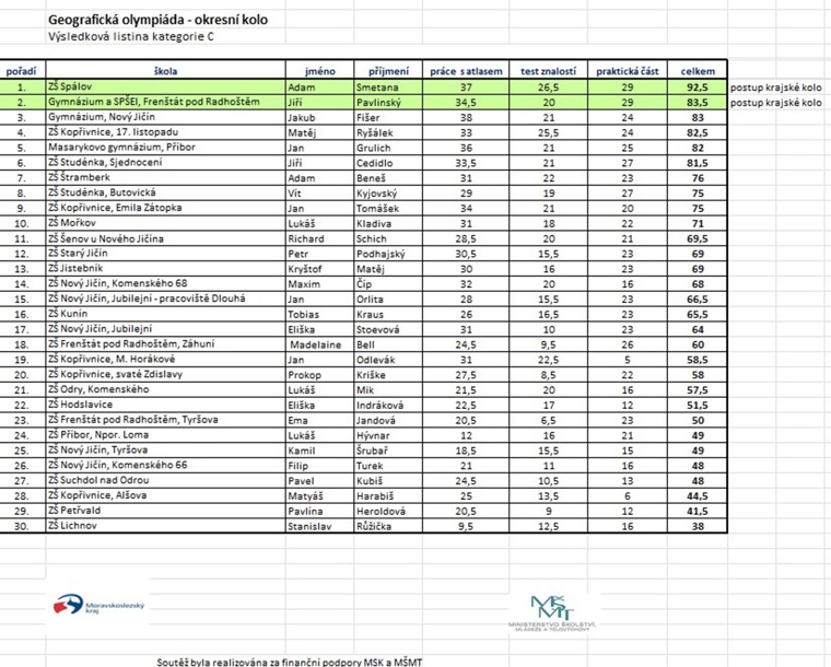 - Jan Gajdůšek, ze třídy 2A – vybojoval 1. místo v kategorii B a postoupil do krajského kola
